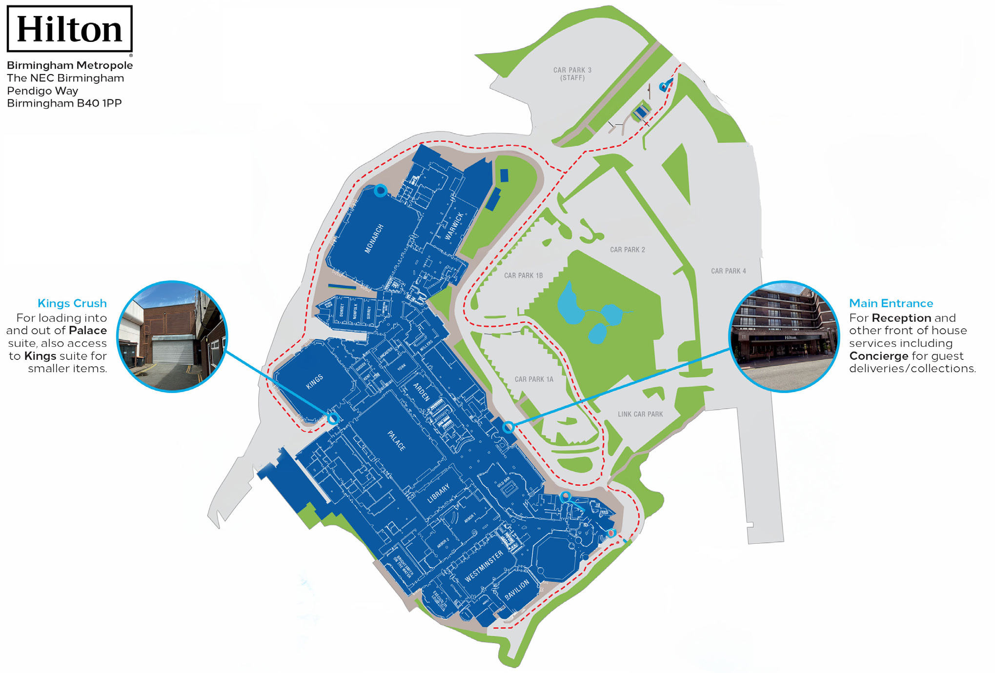 Loading and Unloading will take place at the Palace Suite, on entry to the hotel car park please turn right and press the buzzer which will connect you to the Hotel Security. They will direct you to the loading entrance of the Palace Suite for loading/unloading.